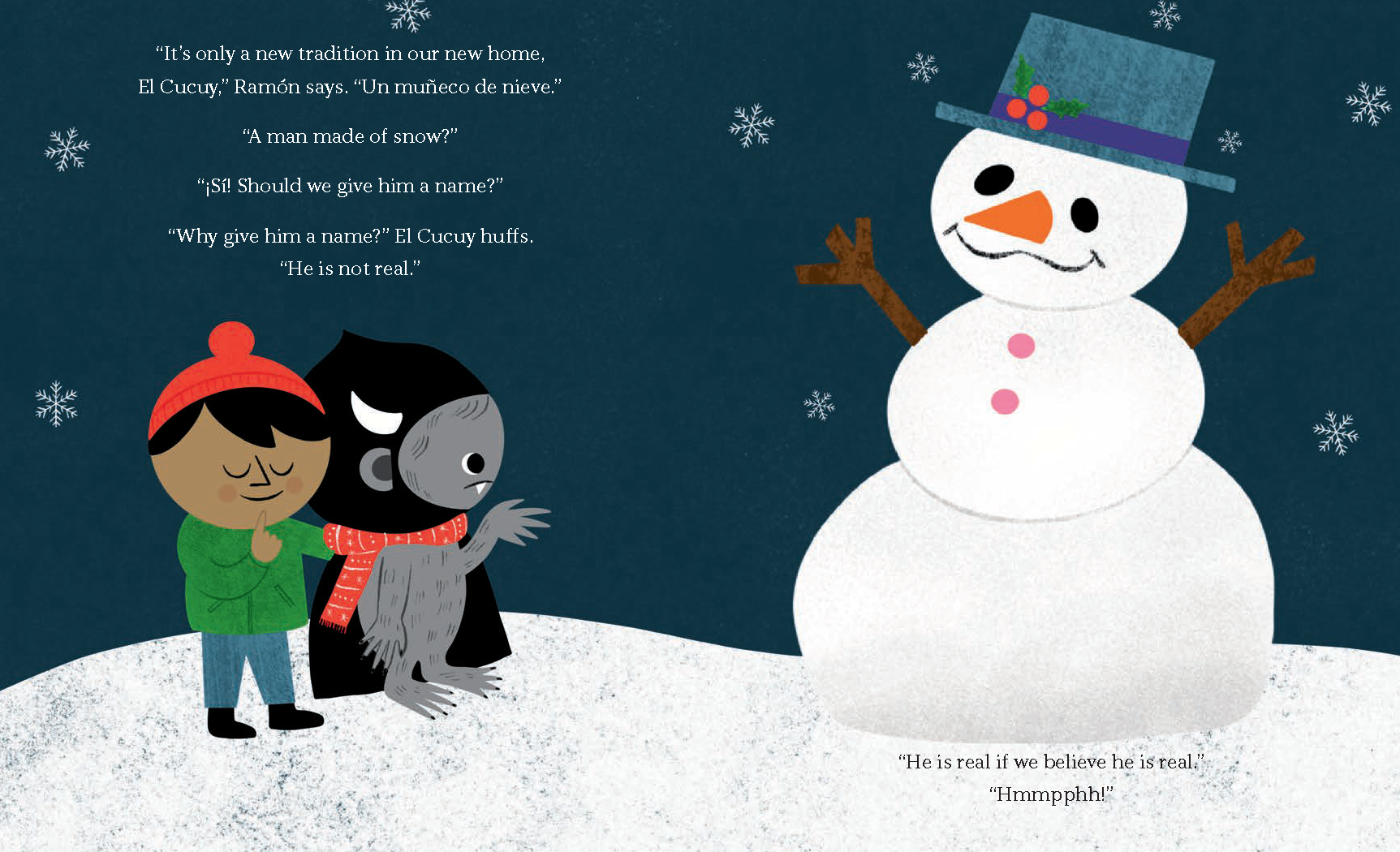El Cucuy is not so sure that celebrations for Las Posadas, Nochebuena, and Navidad are for him. The lights are too bright and the snowman is scary!